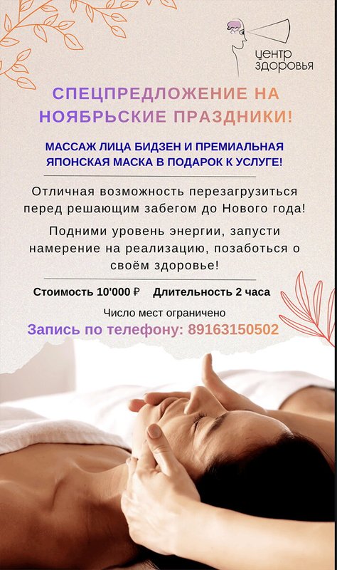 Хочу выразить огромную благодарность центру здоровья за чуткость и профессионализм! Хотя мы опаздывали из Подмосковья и не рассчитали время, персонал пошел нам навстречу — нашли решение и помогли, несмотря на строгий график. Особенно понравилась расслабляющая атмосфера и травяной чай после процедуры «Флоатинг».